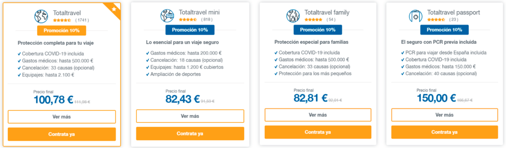 - Prueba PCR antes de viajar: Cada vez más destinos de viaje requieren que los viajeros tengan un certificado PCR negativo. Con el seguro Totaltravel Passport, te garantizan los requisitos de ingreso en el destino de viaje, que también incluye la cobertura COVID-19. Totaltravel Pass incluye un seguro de viaje completo y una prueba de PCR previa al viaje. Si el resultado es positivo y has contratado un seguro con garantía de cancelación, puedes reembolsar el coste del viaje. Si es negativo, puedes acceder al país de destino.